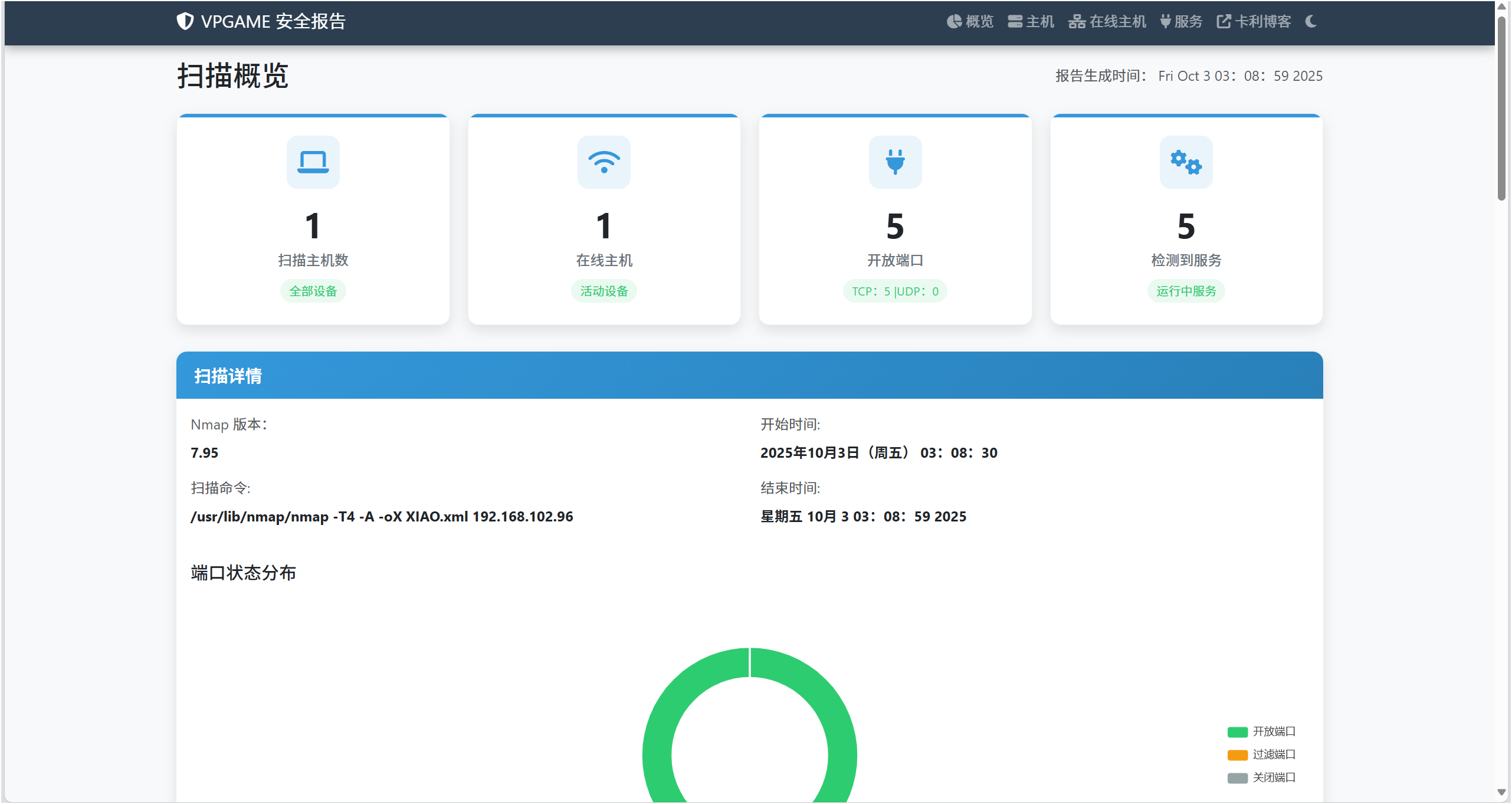 扫描详情页面使用环形图展示端口开放情况,一目了然。