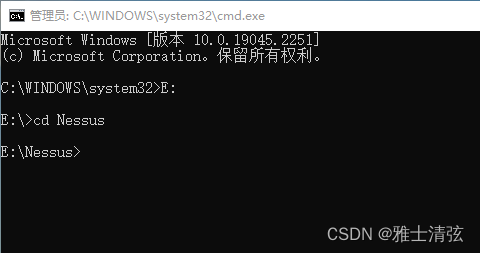 使用 "Win + R ” 快捷键打开命令行,输入 cmd, 再使用 “ ctrl + shift + enter" 三个键进入以管理员身份打开的终端, 进到你的安装目录下,我是 E:\Nessus, 如图所示: