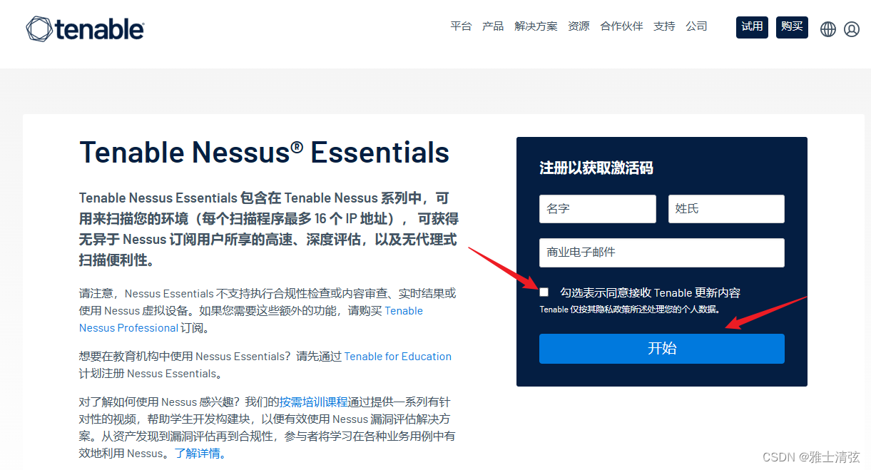 然后打开浏览器访问 https://zh-cn.tenable.com/products/nessus/nessus-essentials 姓和名随便填,邮箱填你的真实邮箱,接收 License,勾选同意,点击开始