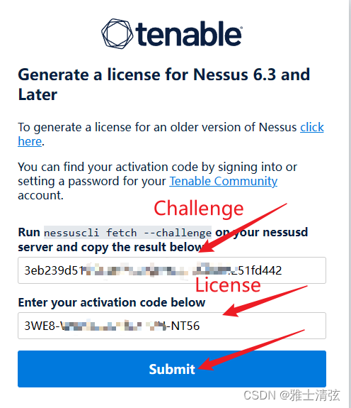 浏览器访问 https://plugins.nessus.org/v2/offline.php ,按照上面顺序记的两个码输入到输入框中,点击 Submit
