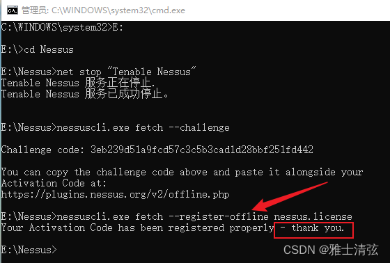 继续在管理员身份的终端 Nessus 目录下输入 nessuscli.exe fetch --register-offline nessus.license ,如图