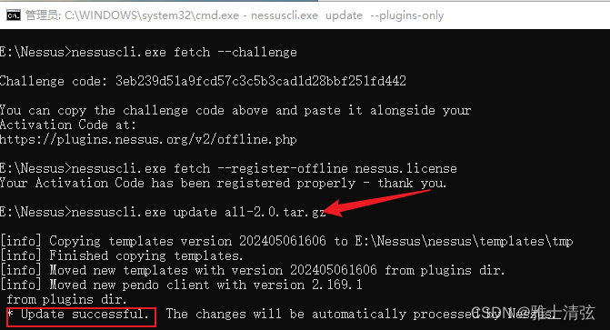 继续输入 nessuscli.exe update .\all-2.0.tar.gz ,如图所示 (图中少了.):