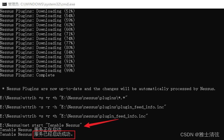 然后再输入 net start "Tenable Nessus" 启动 Nessus 服务,如图所示: