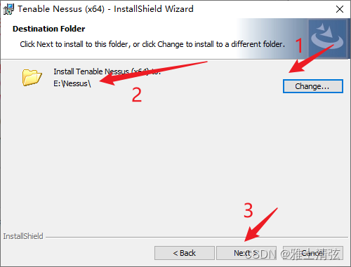 自定义安装目录,我是放在 E 盘,新建 Nessus 目录,Nessus 目录下为空,然后点击 Next->Install, 等待安装成功,点击 Finish。