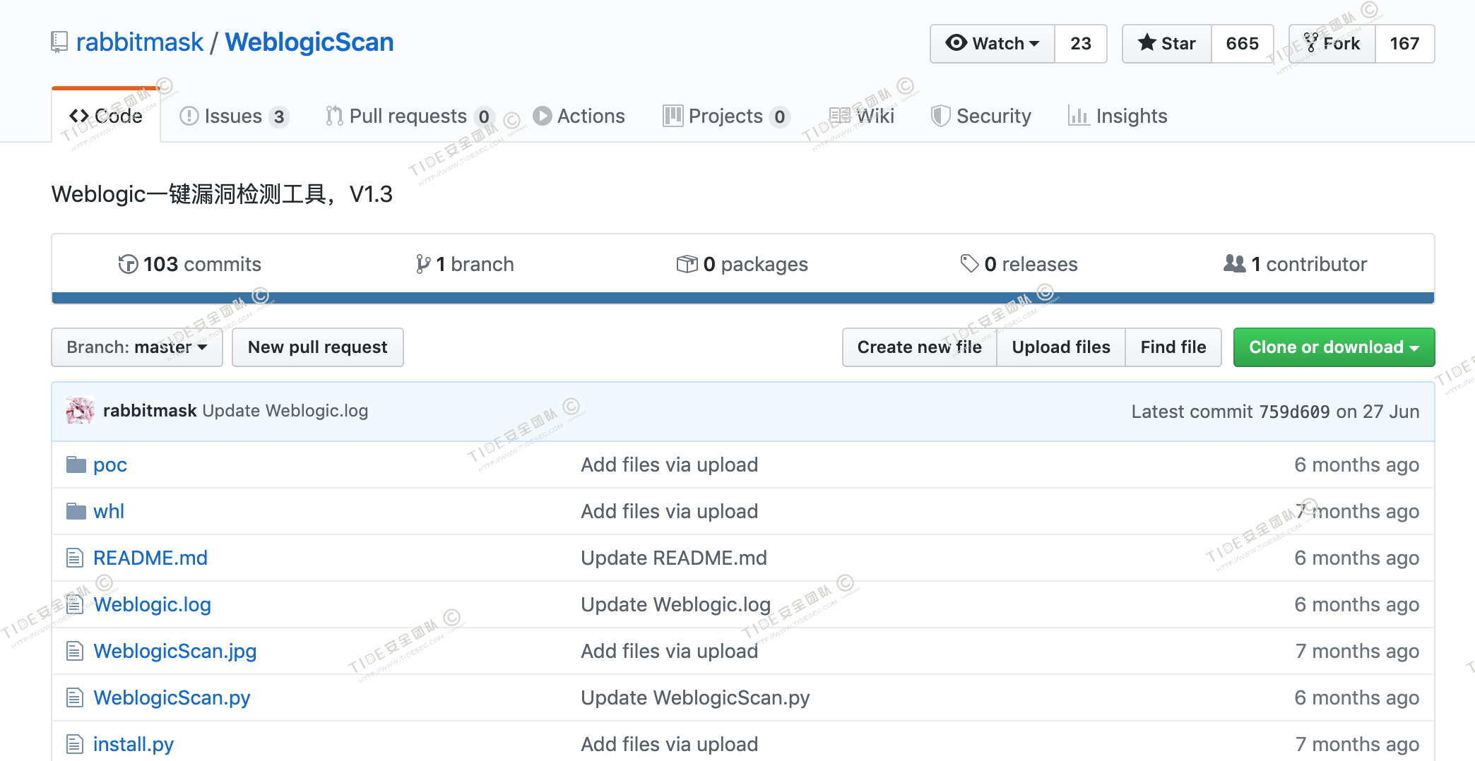 2019年5月,团队成员rabbitmask开源WeblogicScan工具,可以对Weblogic进行一键漏洞检测,目前是Weblogic同类检测工具第一位。