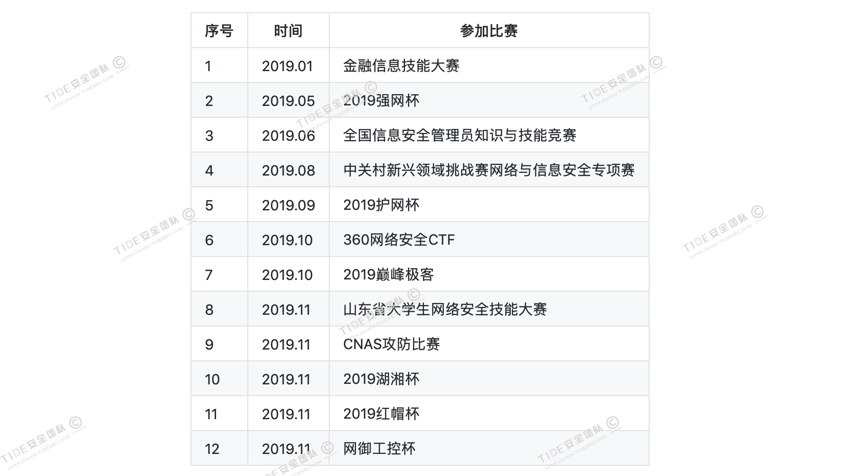 2019年参加CTF比赛共计12场,进入线下赛5场;