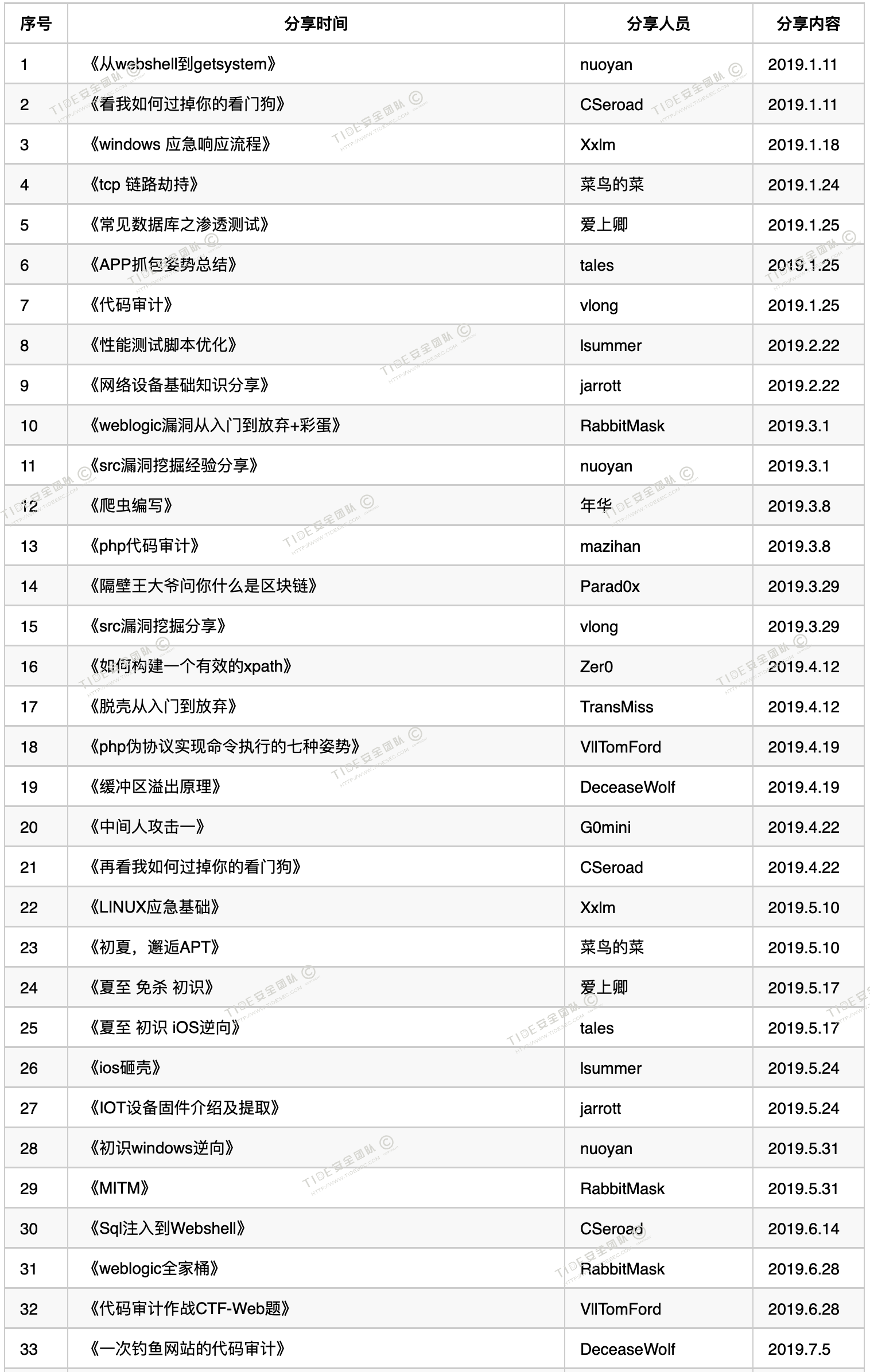 在2019年初,我们还成立了一些兴趣小分队,研究一些安全行业新兴方向以及业务需要的方向,比如应急响应、工控安全、代码审计、移动安全、无线安全、物联网安全等。