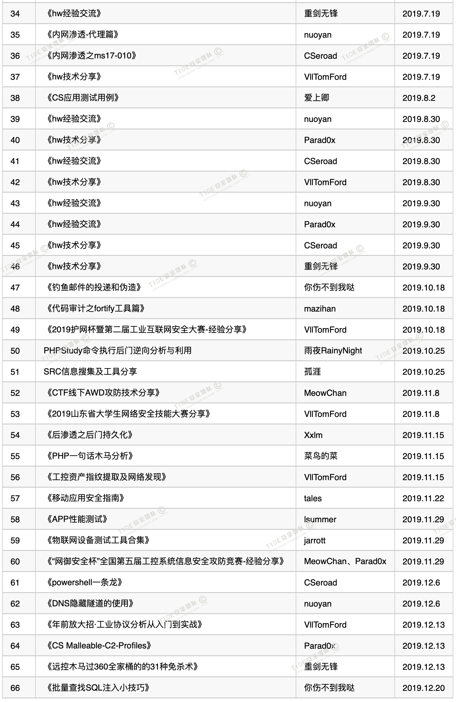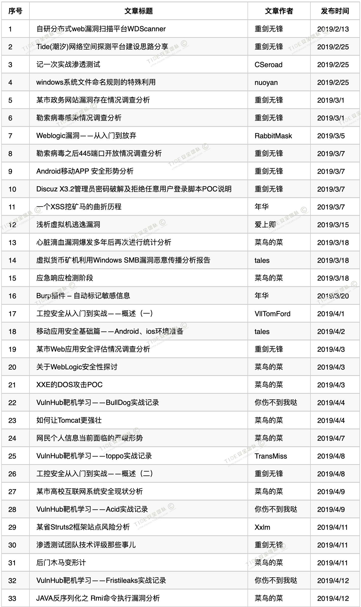 2019年我们创建"TideSec安全团队"公众号,在Freebuf、安全客、简书、安全脉搏知识星球等开设团队专栏,发表原创技术文章135篇,其中30余篇获得原创现金奖励,人均11篇;