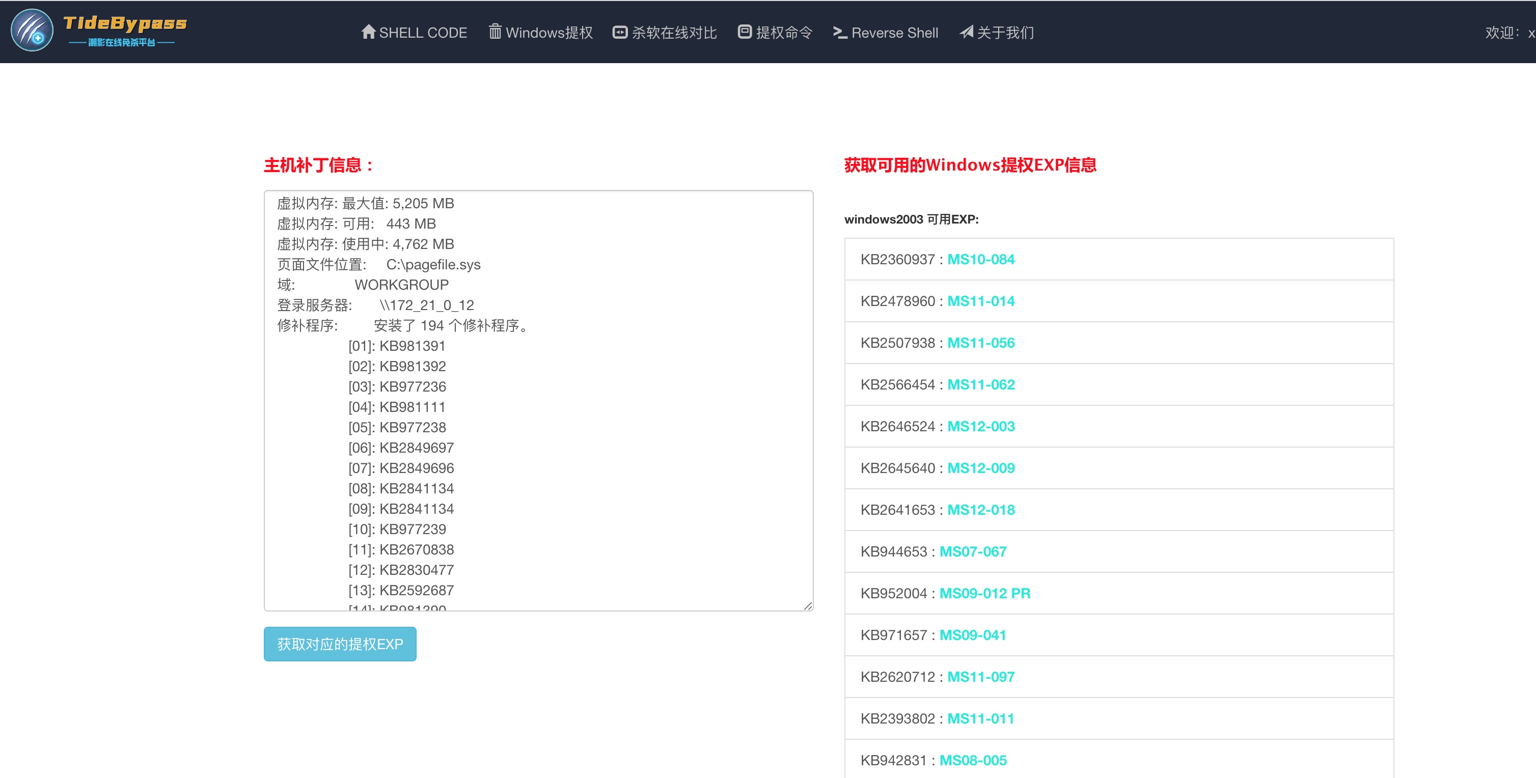 主要提供了Windows提权EXP在线搜索功能。