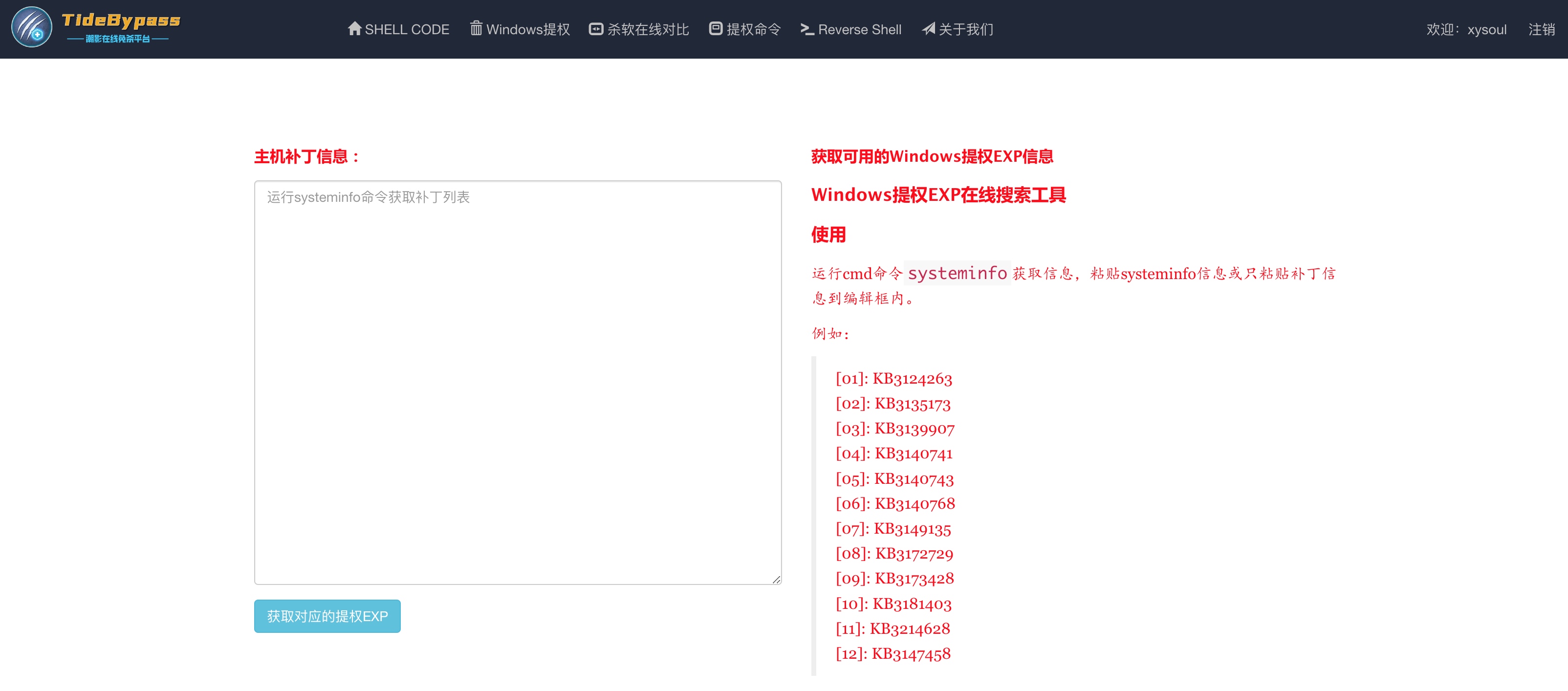 使用方式:运行cmd命令systeminfo获取信息,粘贴systeminfo信息或只粘贴补丁信息到编辑框内。