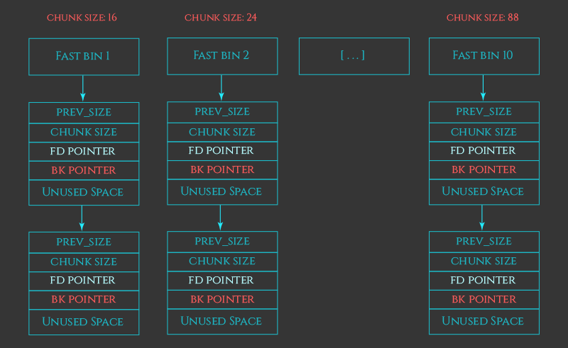Fast bins非常像高速缓存cache,主要用于提高小内存分配效率。相邻空闲chunk不会被合并,这会导致内存碎片增多但是free效率提升。注意:fast bins时10个LIFO的单链表,最后三个链表保留未使用。