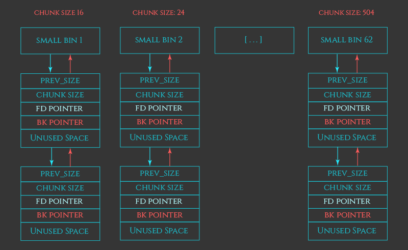 small bins 是 62 个双向循环链表,并且是 FIFO 的,这点和 fast bins 相反。同样相反的是相邻的空闲 chunk 会被合并。chunk大小:0x10-0x1f0字节(64位下0x20-0x3f0),相邻bin存放的大小相差0x8(0x10)字节。