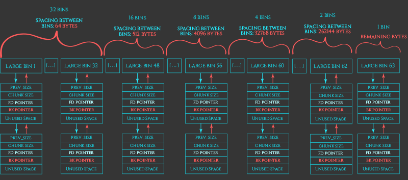 不再是每个bin中的chunk大小都固定,每个bin中存着该范围内不同大小的bin并在过程中进行排序用来加快寻找的速度,大的chunk会放在前面,小的chunk会放在后面