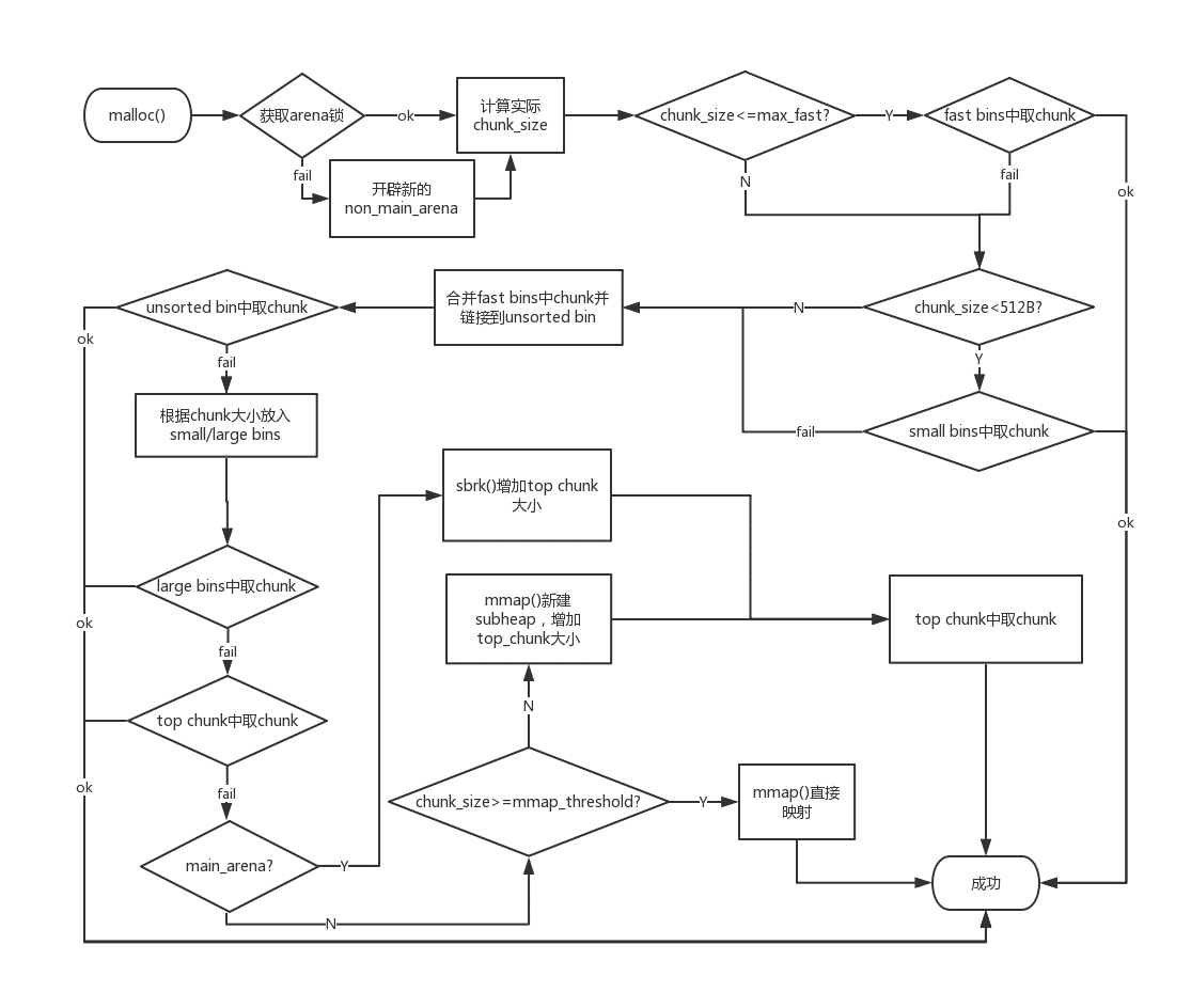 malloc根据用户申请的内存块大小以及相应大小chunk通常使用的频度(fastbin chunk, small chunk, large chunk),依次实现了不同的分配方法。它由小到大依次检查不同的bin中是否有相应的空闲块可以满足用户请求的内存。当所有的空闲chunk都无法满足时,它会考虑top chunk。当 top chunk 也无法满足时,堆分配器才会进行内存块申请。