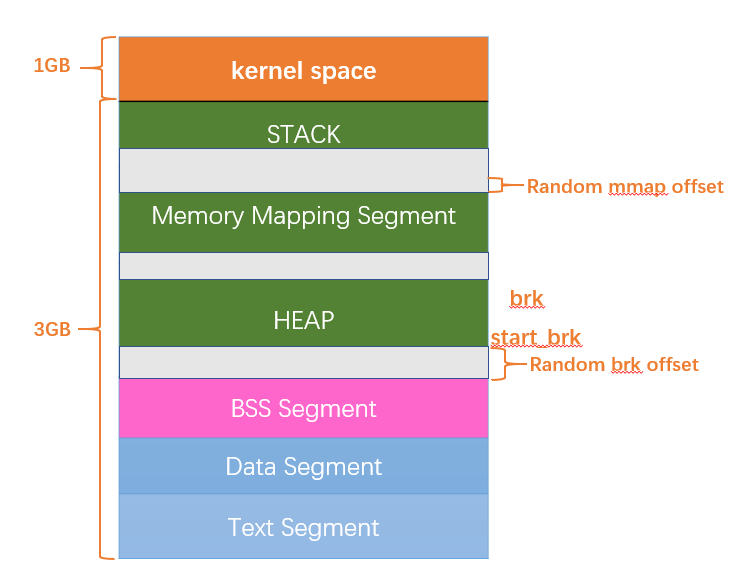 l 开启 ASLR 保护时,start_brk 以及 brk 也会指向同一位置,只是这个位置是在 data/bss 段结尾后的随机偏移处。