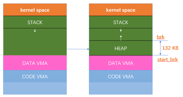 初始时,堆的起始地址 start_brk 以及堆的当前末尾 brk 指向同一地址。根据是否开启 ASLR,两者的具体位置会有所不同。