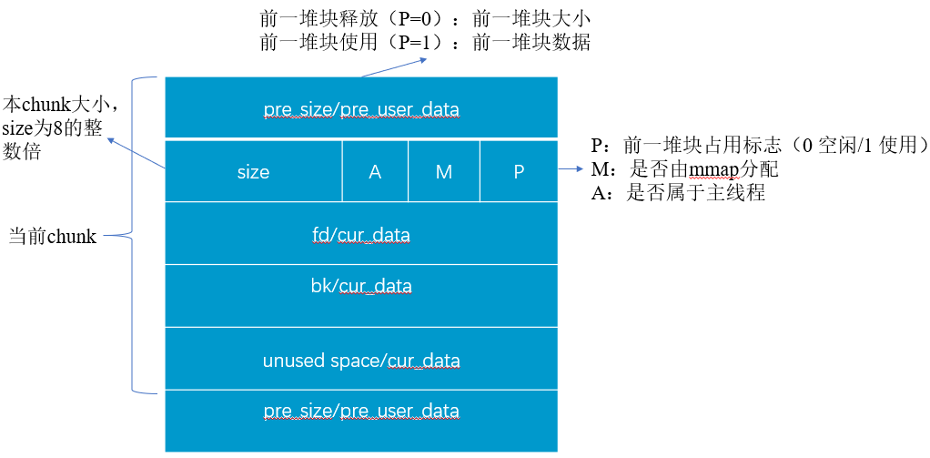 fd,bk。 chunk 处于分配状态时,从 fd 字段开始是用户的数据。chunk 空闲时,会被添加到对应的空闲管理链表中,其字段的含义如下: