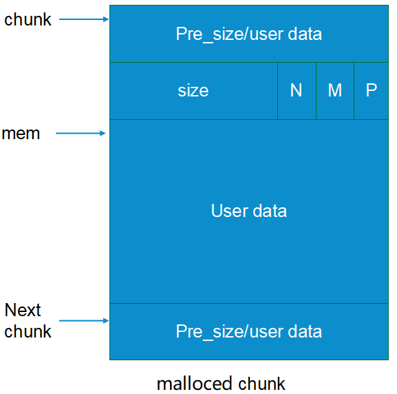 Allocated chunk,如果上一块的chunk是free的状态,则pre_size为连续内存块的上一块chunk的大小,否则用于存储前一个chunk的数据。Size位记录着当前chunk的大小(包括header),其中有三个flag。下图为malloced chunk。