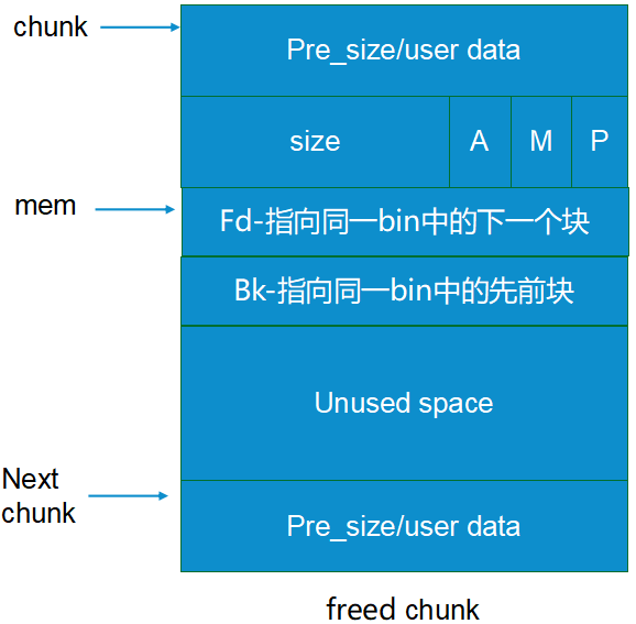 Freed chunk多两个指针fd_nextsize、bk_nextsize指向前一块和后一块large chunk