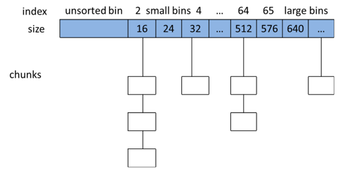 索引从 2 到 63 的 bin 称为 small bin,同一个 small bin 链表中的 chunk 的大小相同。两个相邻索引的 small bin 链表中的 chunk 大小相差的字节数为 2 个机器字长,即 32 位相差 8 字节,64 位相差 16 字节。
