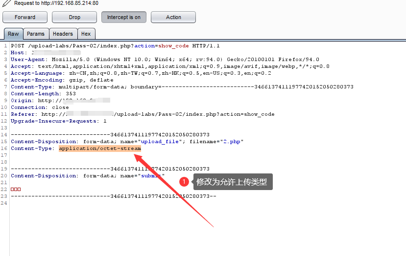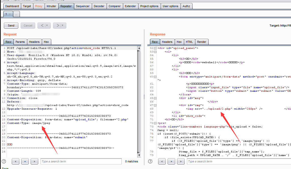 所以进行抓包,将Content-Type修改为允许上传的类型(image/jpeg、image/png、image/gif)三选一。