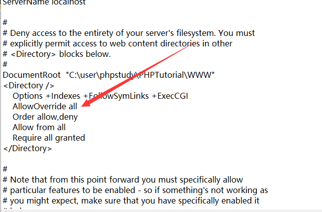 箭头指向位置一开始none,改为all保存,重启phpstudy,就可以了。