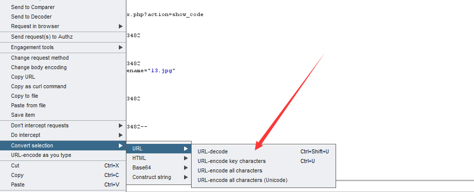 第十三关和第十二关是差不多的,只不过是接受值变成了post,她两的差别呢就是get会自行解码,post不会自行解码,我们需要对%00进行编码,选中%00右键,按下图操作来