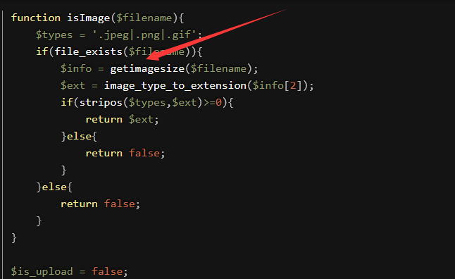 我们来看这个 getimagesize函数,这个函数的意思是:会对目标文件的16进制去进行一个读取,去读取头几个字符串是不是符合图片的要求的
