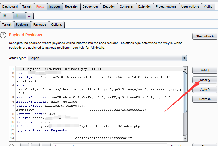 操作:直接上传一个php文件,然后进行抓包,将数据包发送至intruder下,如图操作