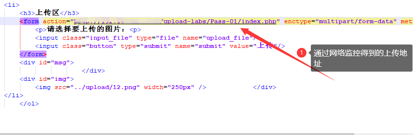 然后我们在用Notepad打开我们自己的html文件,修改action,这个action是告诉他这个图片提交给谁,因为这个源代码中没有,我们就自己加一个。