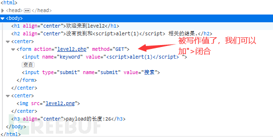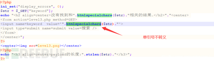 有人可能会问为啥这里不能用前面两关的方法了?因为源码把上面漏洞闭合了,加了一对双引号,绕不出去了(作者故意的)