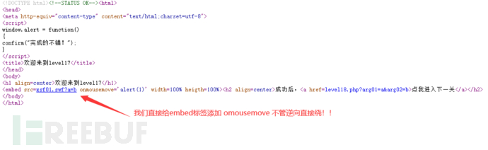 标签,是用来嵌入图片的。可以用onclick或onmouseover绕过。因为这两个变量是互相拼接起来的,所以在输入arg02时在b之后加一个空格,当浏览器解析到b的时候就停止判断,然后将onclick或onmouseover看作另外一个属性。